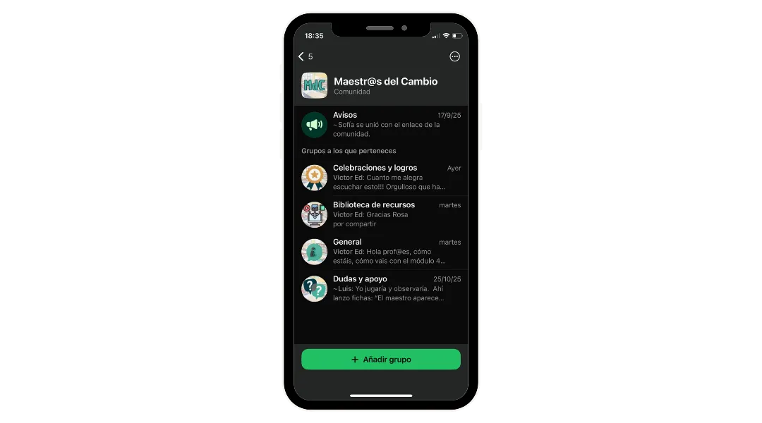 El acompañamiento se realiza en sesiones grupales, porque el trabajo en grupo es una parte clave del proceso. Compartir casos, escuchar a otros docentes y trabajar juntos reduce mucho la sensación de soledad y multiplica los aprendizajes. Las sesiones están diseñadas para que recibas claridad y feedback aplicable a tu caso concreto.