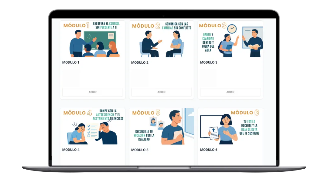 No se basa solo en teoría ni en métodos aislados. Aquí trabajamos casos reales, situaciones concretas de aula, tu manera de poner límites, tu energía, tu autoexigencia y tu forma de liderar. Hay estructura, pero también acompañamiento y trabajo interior, que es lo que permite que el cambio se sostenga en el tiempo. Además está impartido por un docente en activo, que conoce muy bien la realidad del aula porque es parte de su día a día.